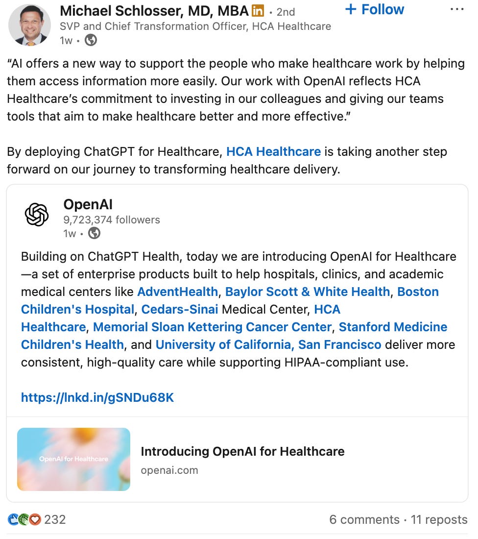 Beyond the consumer, OpenAI is also launching OpenAI for Healthcare, a HIPAA-compliant suite for hospitals and healthcare professionals. It is already being used by major systems like HCA, Memorial Sloan Kettering, and Advent Health.